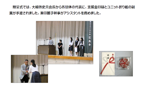 「江風会賞」で現役生の団体・個人に贈呈する支援金は、江風会会員の皆さん方からの、会費・協力金(寄付金)・会報誌協賛広告などを財源としてます。ぜひ、同窓生の皆さん方からのご協力を、心からお願いいたします。会費・協力金の納入は、本ページ最上欄および最下欄の「会費納入・寄付金」バナーあるいは、こちらから。