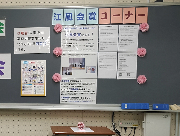 「江風会」の主な活動として、母校の東淀川高校を支援する活動があります。今年度(2025年)、その取り組みの一つとして、現役生を支援する「江風会賞」を新設しました。この「江風会賞」を現役生をはじめ母校の関係者の皆さん方に知らせる展示が本企画です。