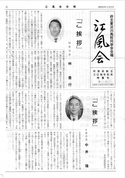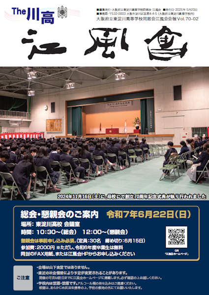 創刊号は、何と昭和62年(1987年)に発行された、「同窓会創立30周年記念特集号」です。創立30年まで会報誌が発行されていなかったのです。この時代は、会報誌の名称は「江風会」だったのです。また、2025年度に発行された最新の会報誌は、昨年挙行された母校創立70周年記念式典の写真が表紙を飾っています。創刊号(下図左)はクリックで表紙の拡大画像(PDF)、最新号(下図右)はクリックで最近の会報誌が閲覧できます。